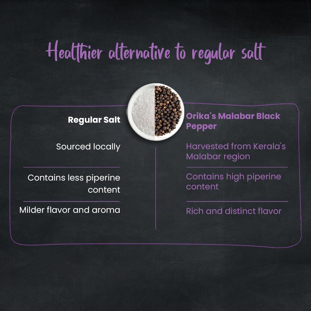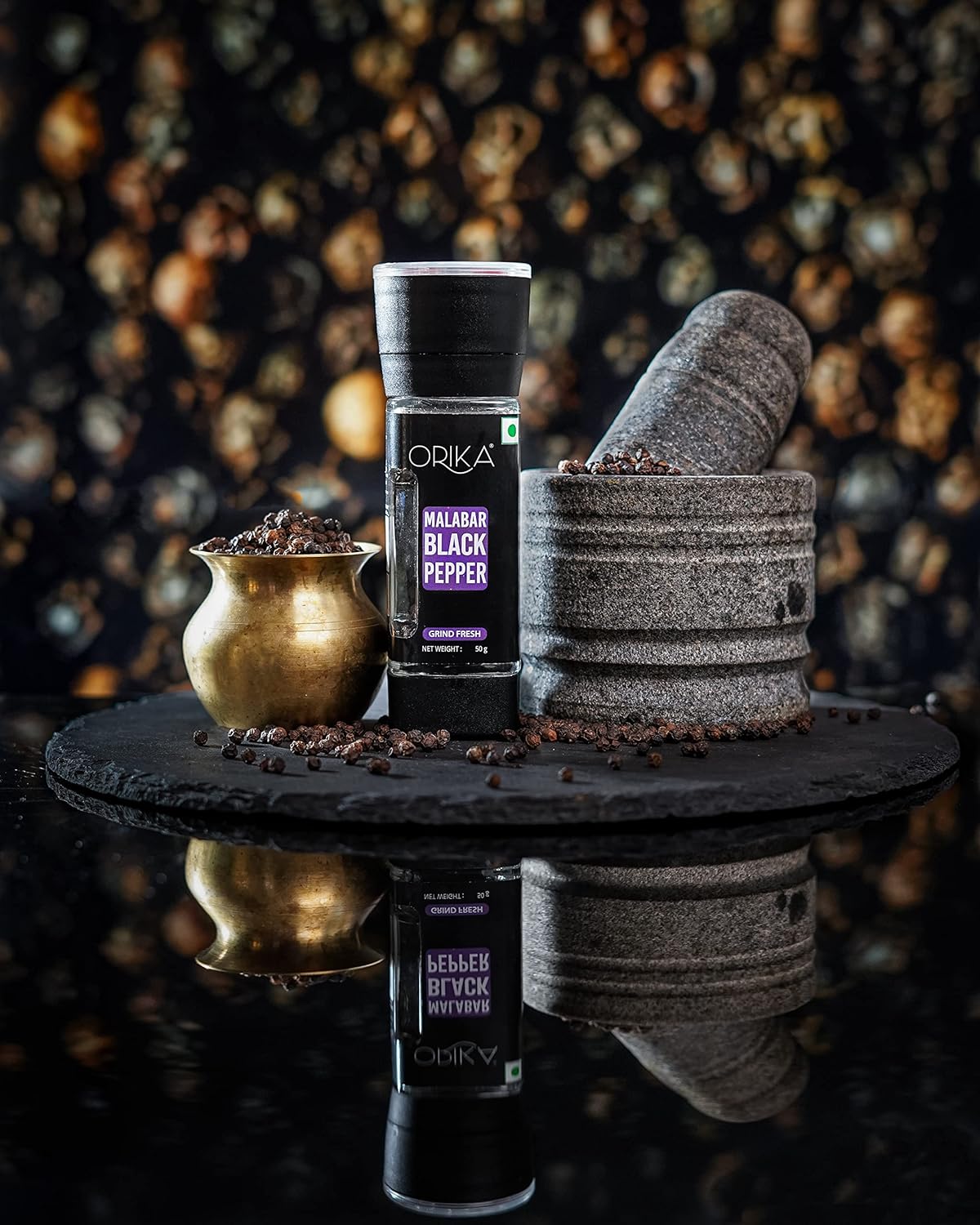 Sourced directly from kerala’s Malabar region, famous for the world’s finest quality of black pepper containing high piperine content and potent antioxidant properties. Grown in the black soil of Malabar, black peppercorns are left to ripen in the open a little longer to get the complex and fresh, Orika’s Malabar pepper delivers you rich taste and aroma comparable to nothing else.