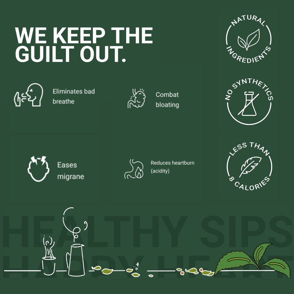 Hand-picked green tea leaves from local Indian farms, with refreshing blend of spearmint and peppermint leaves.