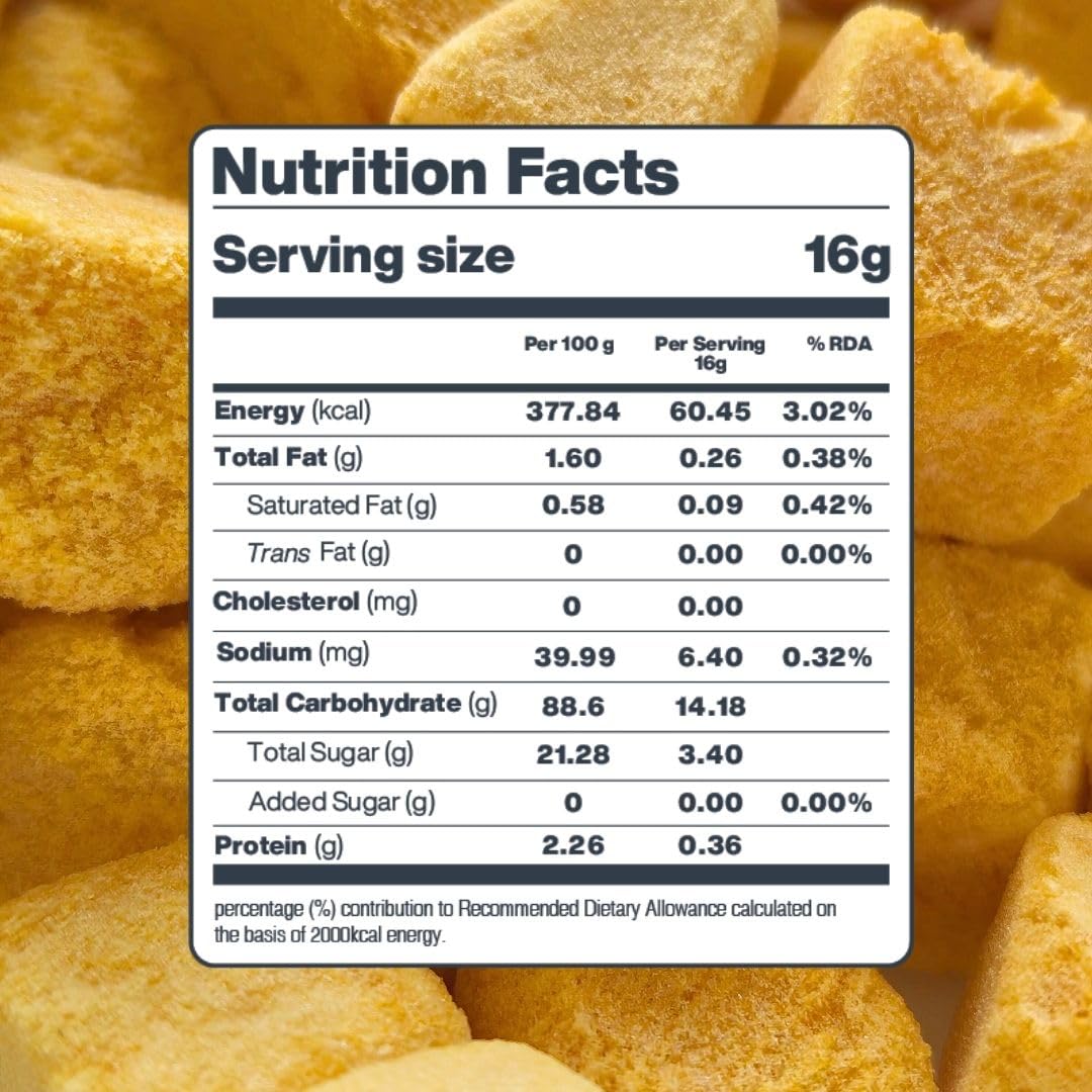 Nutrient-rich Freeze Dried Mango Chips are made from 100% natural, freshly picked mangoes with no preservatives or added sugar. Perfect for kids and on-the-go, each pack contains 16 gm and is vegan-friendly with a 365-day shelf life. A healthy, delicious snack option.