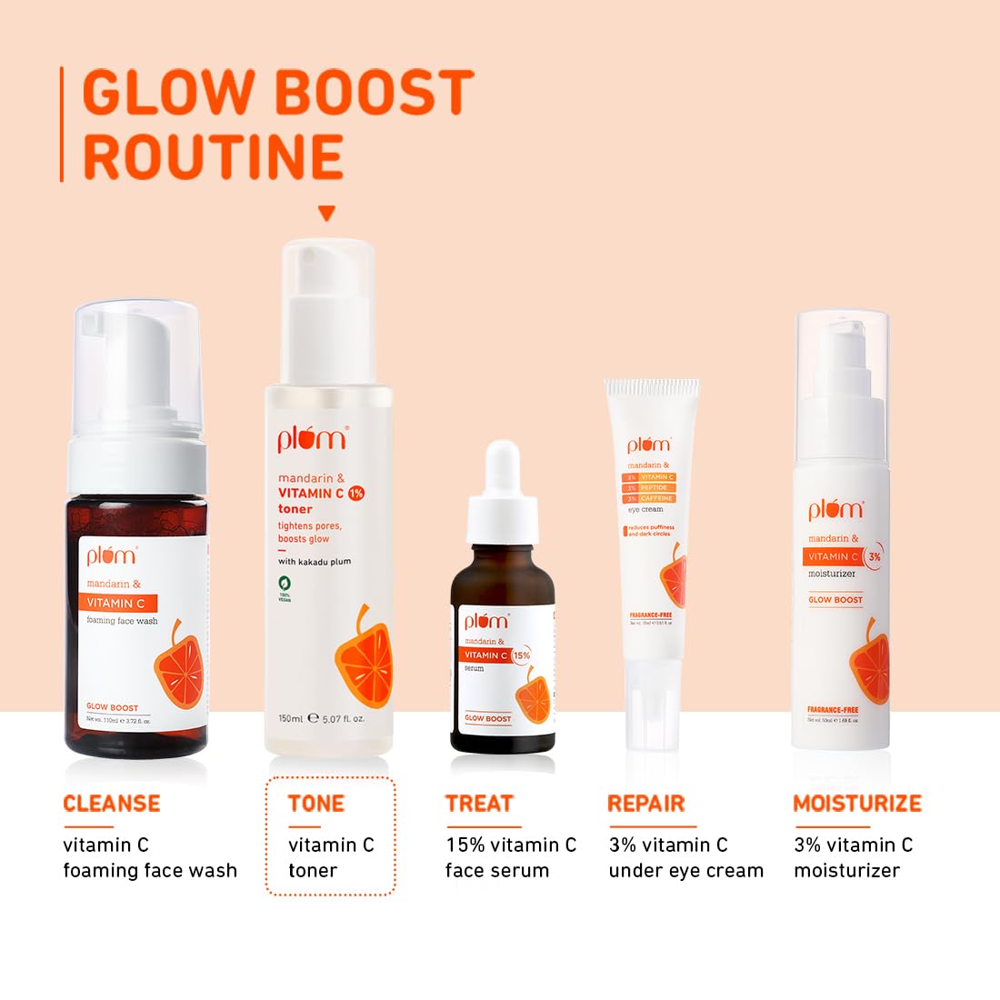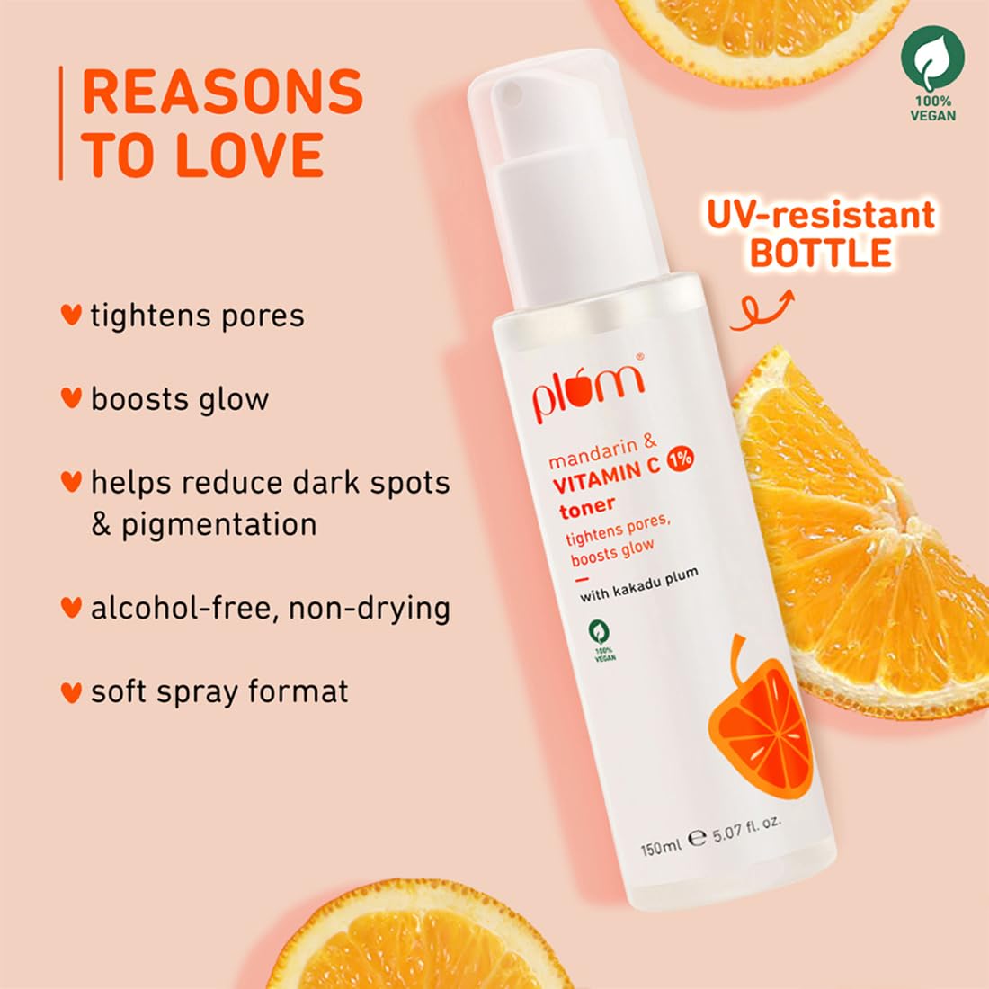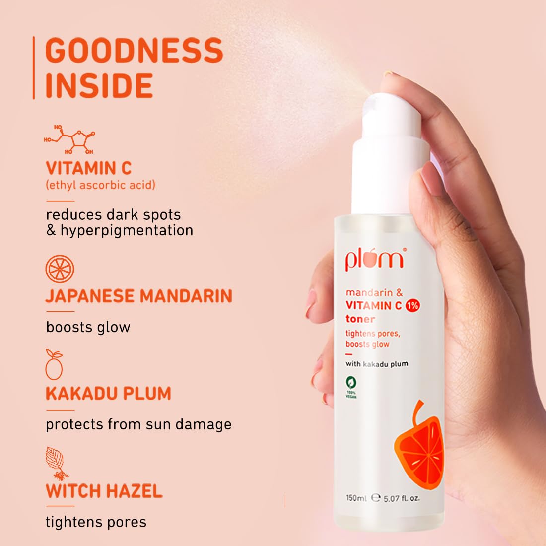 Plum Vitamin C Face Toner with Mandarin and Kakadu Plum reduces dark spots, boosts glow, and tightens pores, leaving your skin refreshed, smooth, and radiant.