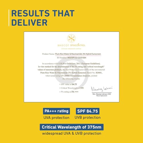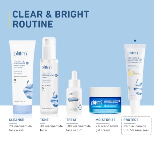 • Plum Niacinamide & Rice Water Hybrid Face Sunscreen with SPF 50 PA+++ | Protects & Brightens Skin | No White Cast | Reduces Blemishes | UVA & UVB Protection | All Skin Types | 100% Vegan | 15 g