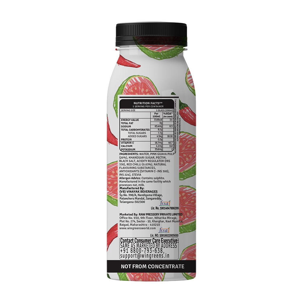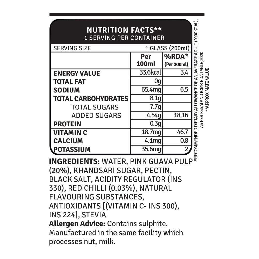 WATER, PINK GUAVA PULP (20%), KHANDSARI SUGAR, PECTIN, BLACK SALT, ACIDITY REGULATOR (INS 330), RED CHILLI, NATURAL FLAVOURING SUBSTANCES, ANTIOXIDANTS [(VITAMIN C- INS 300), INS 224], STEVIA