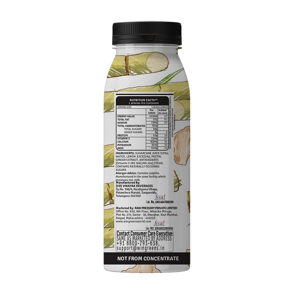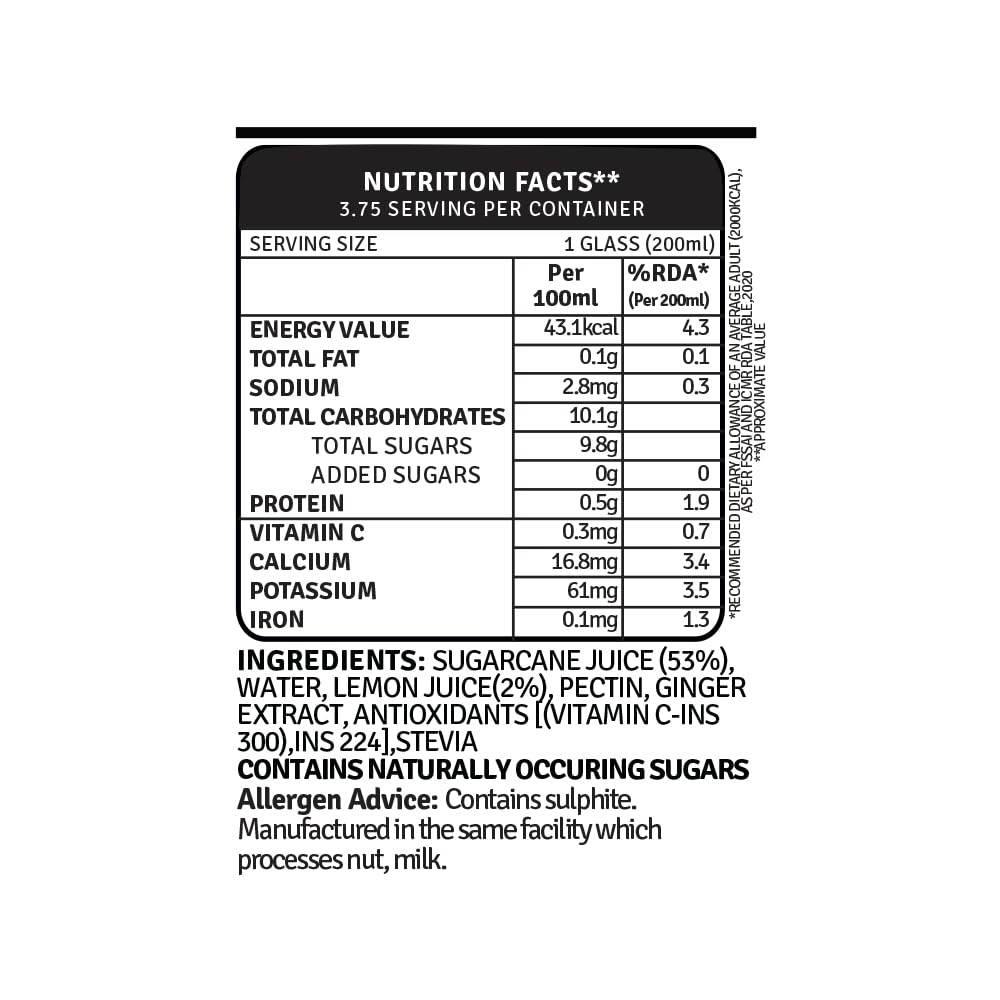 SUGARCANE JUICE (53%), WATER, LEMON JUICE(2%), PECTIN, GINGER EXTRACT, ANTIOXIDANTS [(Vitamin C-INS 300),INS 224],STEVIA