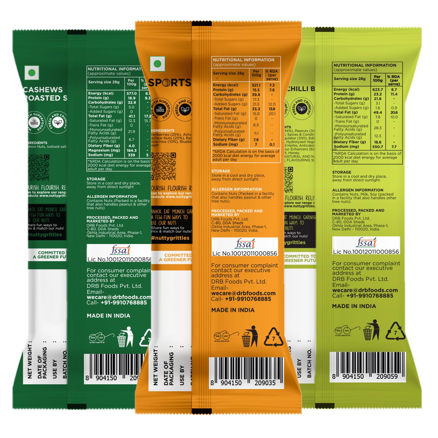 • Contents: 3 packs of Cashews, Sports Mix, and Thai Chilli Flavoured Roasted & Salted, 40g each. Net weight: 120g.