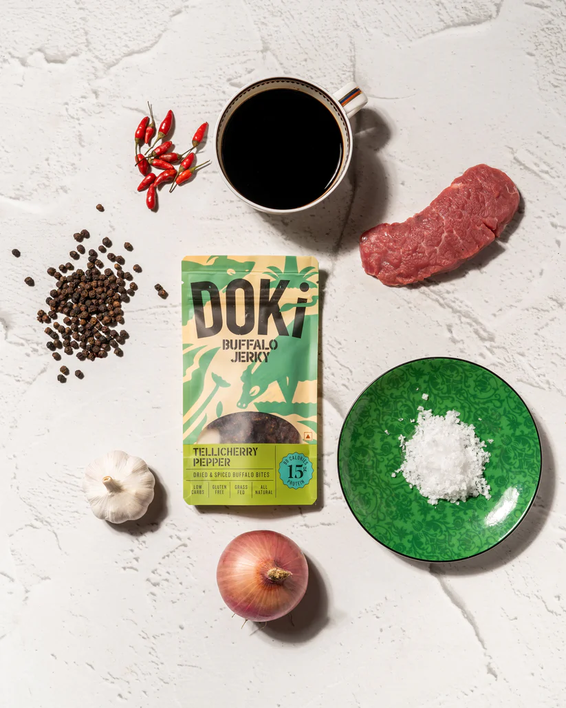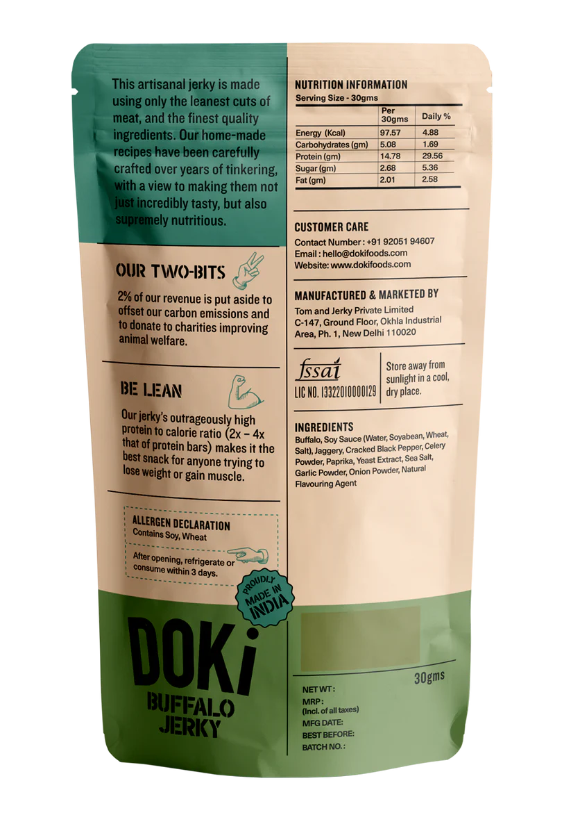 Buffalo, Soy Sauce, Jaggery, Cracked Black Pepper, Celery Powder, Paprika, Yeast Extract, Sea Salt, Garlic Powder, Onion Powder, Natural Flavouring Agent