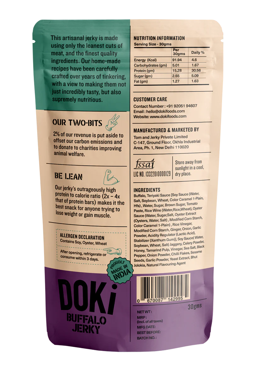 Buff, Teriyaki Sauce [Soy Sauce, Water, Sugar, Brown Sugar, Tomato Paste, Rice Wine, Oyster Sauce, Rice Vinegar, Modified Corn Starch, Ginger, Onion, Garlic Powder, Acidity Regulator (Lactic Acid), Stabilizer (Xanthum Gum)], Soy Sauce, Jaggery, Celery Powder, Honey, Tamarind Pulp, Vinegar, Sea Salt, Black Pepper, Onion Powder, Chilli Flakes, Sesame Seeds, Garlic Powder, Yeast Extract, Bhut Jolokia, Natural Flavouring Agent